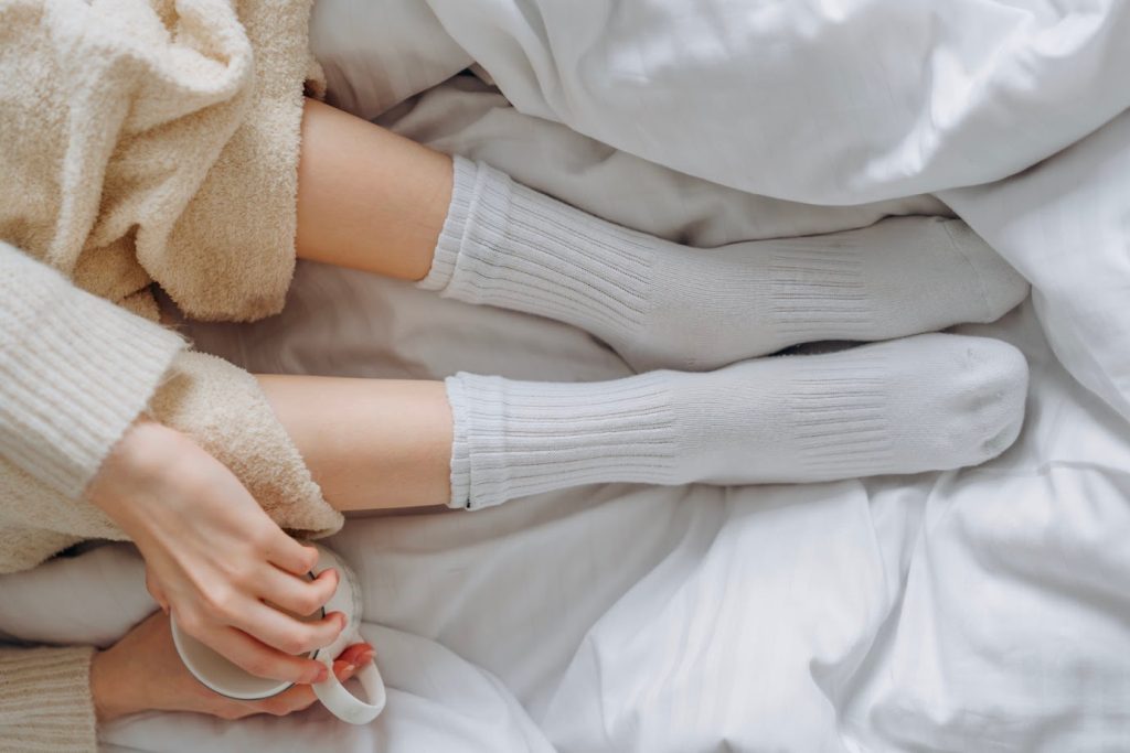 To warm yourself before bed time, get into the routine of having a warm milky drink in the evening. Not only will the drink warm you from the inside, but milk contains tryptophan which helps the body prepare for sleep.